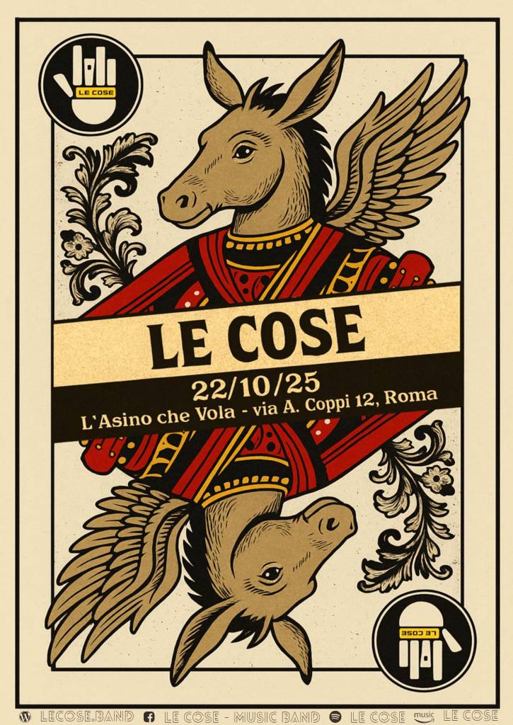 Le Cose saranno live il 22 ottobre 2025 presso l’Asino che Vola di Roma, a via Antonio Coppi 12. Una delle ultime occasioni per ascoltare ancora una volta questo storico gruppo italiano, prima che si ritiri per raggiunti limiti di età.
